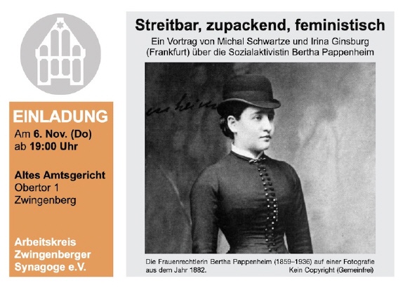 Wir laden Sie herzlich zu unserer nächsten Veranstaltung ein - am 6. November (Donnerstag) um 19:00 Uhr in den Saal des Alten Amtsgerichts, Obertor 1. Die beiden Frankfurterinnen Michal Schwartze und Irina Ginsburg, die sich intensiv mit jüdischem Feminismus beschäftigen, stellen die jüdische Sozialaktivistin und Frauenrechtlerin Bertha Pappenheim (1859–1936) vor. Sie werden zeigen, welche Vorreiterrolle Bertha Pappenheim in ihrer konkreten Sozialarbeit in Frankfurt und als erste Vorsitzende des Jüdischen Frauenbundes gespielt hat.